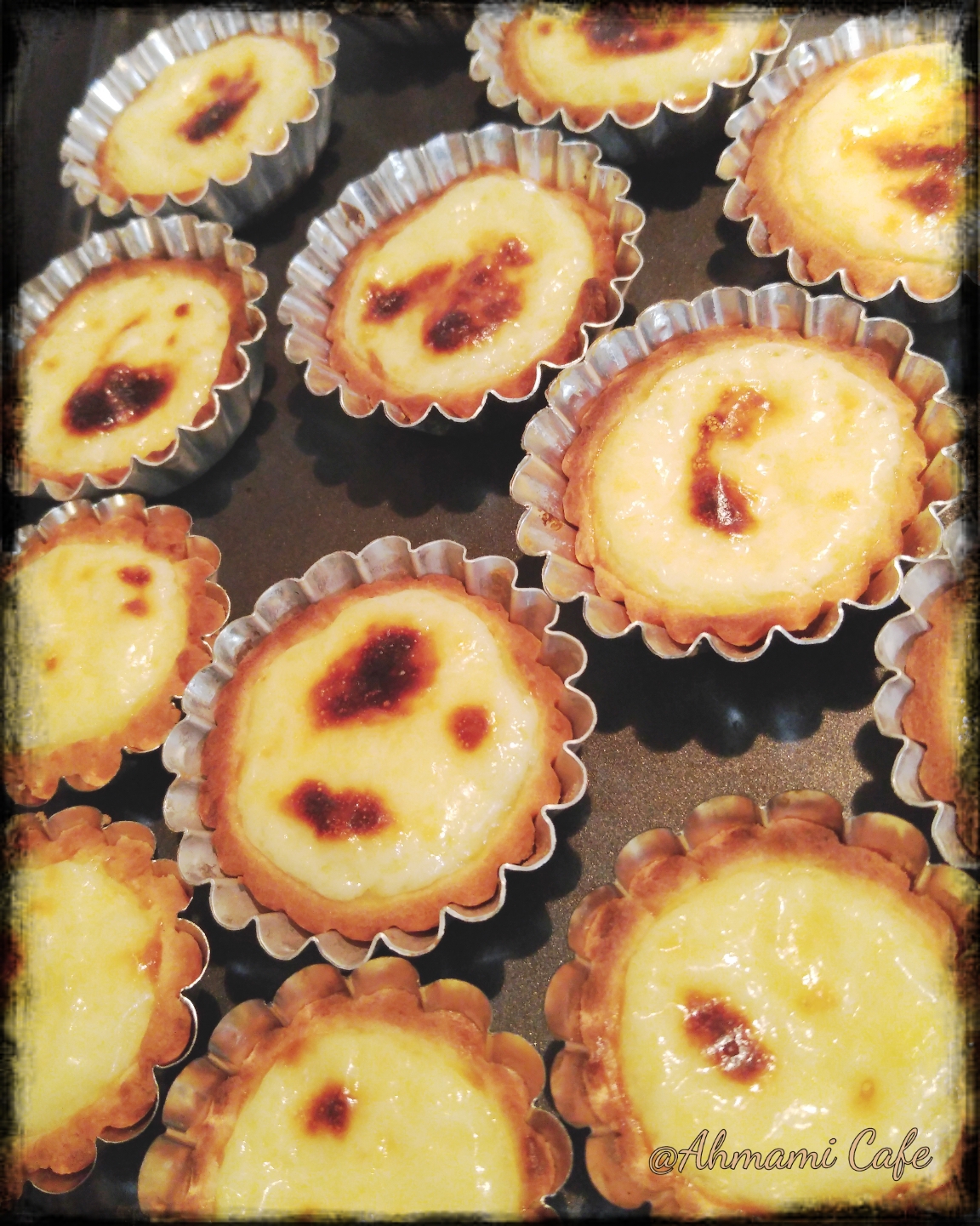 - Brush egg wash on top of the fillings (Pic 15). Then bake in the preheated oven for about 8 to 10 minutes (Pic 16). Remove the tarts from the oven and place them on a wire rack for ½ minute. Remove from the tins. Serve hot. Sprinkle cocoa powder if desired. The leftovers can be refrigerated in an air-tight container after completely cooled down. Reheat them in a low-temperature oven.